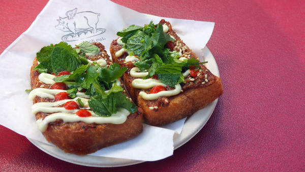 It’s a tiny red shack with two chefs serving chicken liver pâté-smeared baguettes stuffed with braised pork belly; shrimp toast covered in a maze of kewpie mayonnaise; and chicken wings and ribs doused with sticky Vietnamese caramel.